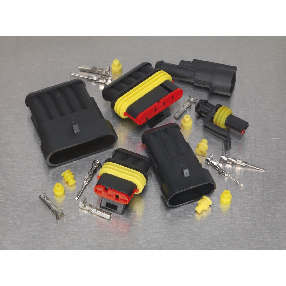 - Designed for applications when a waterproof joint is required. - Suitable for cable sizes from 0.5mm to 1.5mm. - Kit contains male and female housing, terminals and seals. - Waterproof to IP65. - Contents: 1-Way Female Connector (x6), 1-Way Male Connector (x6), 2-Way Female Connector (x6), 2-Way Male Connector (x6), 3-Way Female Connector (x4), 3-Way Male Connector (x4), 4-Way Female Connector (x4), 4-Way Male Connector (x4), 5-Way Female Connector (x3), 5-Way Male Connector (x3), 6-Way Female Connector (x2), 6-Way Male Connector (x2), Rubber Seal (x100), Female Pin (x100), Male Pin (x100). - Model No. SSCSET1- Designed for applications when a waterproof joint is required and is suitable for cable sizes from 0.5mm to 1.5mm. - Kit contains male and female housing, terminals and seals. - Waterproof to IP65.