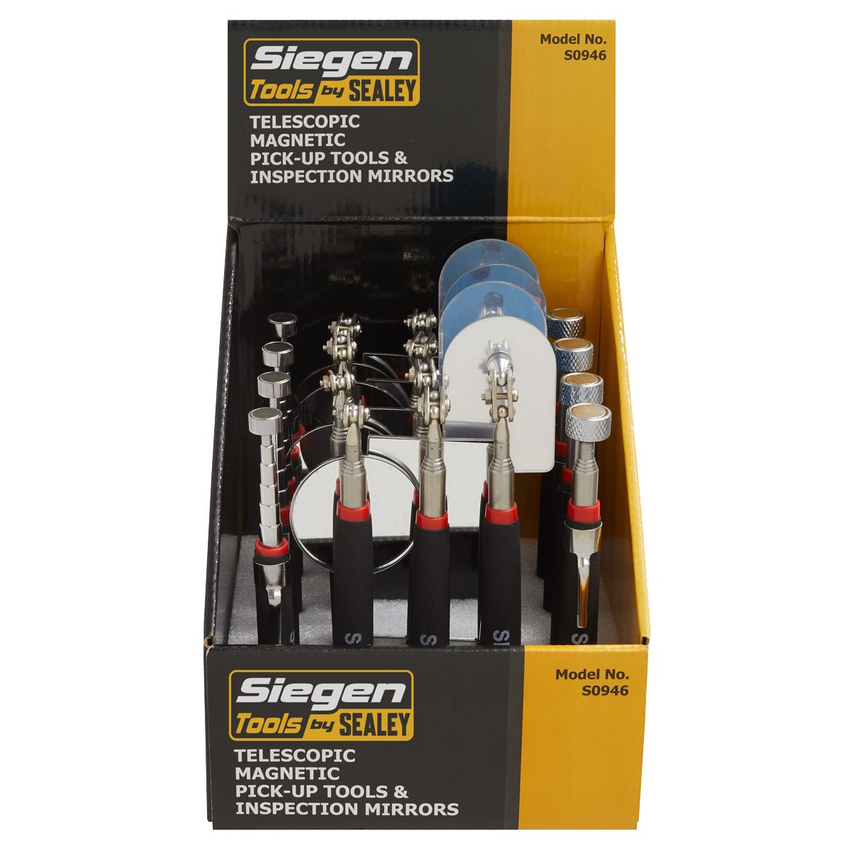 - Comprises a variety of popular pick-up tools and inspection mirrors, four of each type. - 7-Section stainless steel magnetic pick-up tool with a 2.25kg capacity 11mm magnet. - 5-Section stainless steel magnetic pick-up tool with a 3.6kg capacity 13mm magnet. - 5-Section stainless steel 50mm inspection mirror mounted on twin ball joints. - 5-Section stainless steel 45 x 65mm inspection mirror mounted on twin ball joints. - 5-Section stainless steel 50 x 90mm inspection mirror mounted on twin ball joints. - Textured grip for added user comfort. - Pick-up tools also supplied with convenient pocket-clip. - Lifetime guarantee*. - Model No. S0946- Part of the Siegen by Sealey range of quality tools at competitive prices. - Comprises a variety of popular pick-up tools and inspection mirrors, four of each type. - 7-Section stainless steel magnetic pick-up tool with a 2.25kg capacity 11mm magnet. - 5-Section stainless steel magnetic pick-up tool with a 3.6kg capacity 13mm magnet. - 5-Section stainless steel 50mm inspection mirror mounted on twin ball joints. - 5-Section stainless steel 45 x 65mm inspection mirror mounted on twin ball joints. - 5-Section stainless steel 50 x 90mm inspection mirror mounted on twin ball joints. - Textured grip for added user comfort. - Pick-up tools also supplied with convenient pocket-clip. - Lifetime guarantee*.