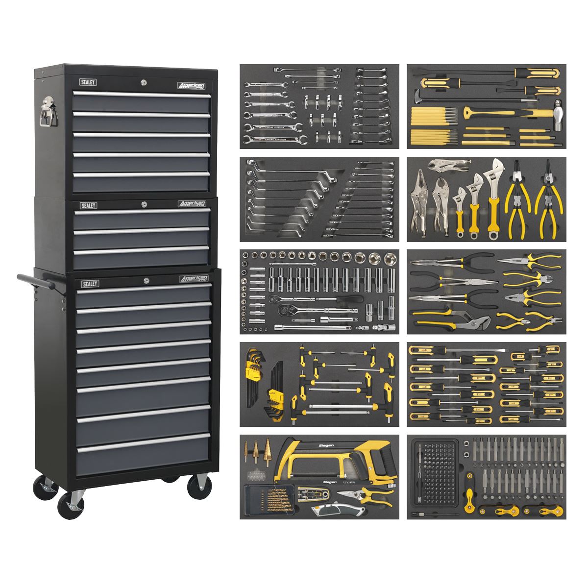 - Package includes: - Model No. AP3505TB - 5 Drawer Topchest with Ball Bearing Slides - Black/Grey. - Overall Size (W x D x H): 600 x 305 x 470mm. - Model No. AP3503TB - 3 Drawer Mid-Box with Ball Bearing Slides - Black/Grey. - Overall Size (W x D x H): 605 x 310 x 275mm. - Model No. AP3508TB - 8 Drawer Rollcab with Ball Bearing Slides - Black/Grey. - Overall Size (W x D x H): 615 x 330 x 885mm. - 420pc Tool Kit - Includes Model No's: S01120, S01124, S01125, S01126, S01127, S01129, S01130, S01131, S01133, S01134. - This item is heavy. Extra assistance must be provided at the delivery point to help its safe delivery. - Model No. AP35TBCOMBO- Manufactured with double skin side walls for extra strength and finished in smooth, hi-gloss, triple baked enamel. - Smooth ball bearing drawer slides provide superior performance and carry heavier loads. - Features hard compound rubber wheels, two fixed and two locking castors. - All drawers have been specifically sized to accommodate our range of Siegen tool trays. Package includes: - AP3505TB - Topchest 5 Drawer - Black/Grey - AP3503TB - Mid-Box 3 Drawer - Black/Grey - AP3508TB - Rollcab 8 Drawer - Black/Grey - S01120 - 62pc 3/8"Sq Drive Socket Set - S01124 - 20pc Combination & Deep Offset Spanner Set - S01125 - 30pc Specialised Spanner Set - Metric - S01126 - 92pc Specialised Bits & Folding Hex Key Set - S01127 - 20pc Screwdriver Set - S01129 - 9pc Pliers Set - S01130 - 10pc Adjustable Wrench & Pliers Set - S01131 - 23pc Pry Bar, Hammer & Punch Set - S01133 - 28pc Cutting & Drilling Set - S01134 - 26pc T-Handle & Standard Hex Key Sets