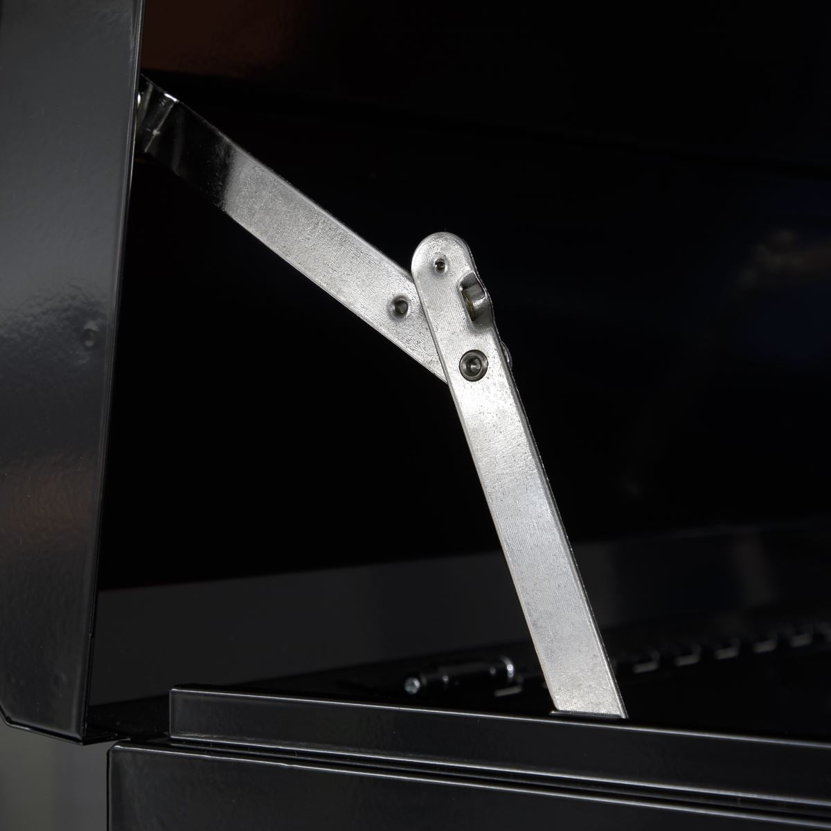 All heavy gauged steel construction and manufactured with steel inner walls for extra strength and durability. Heavy-duty 45mm ball bearing drawer slides provide superior performance and carry heavier loads. Full height rear locking mechanism, locks full-length drawers in multiple locations. Added security provided by tumbler lock, supplied with two folding keys. Rust and solvent resistant powder coat paint finish. Each drawer features aluminium drawer pulls and non-slip liners.