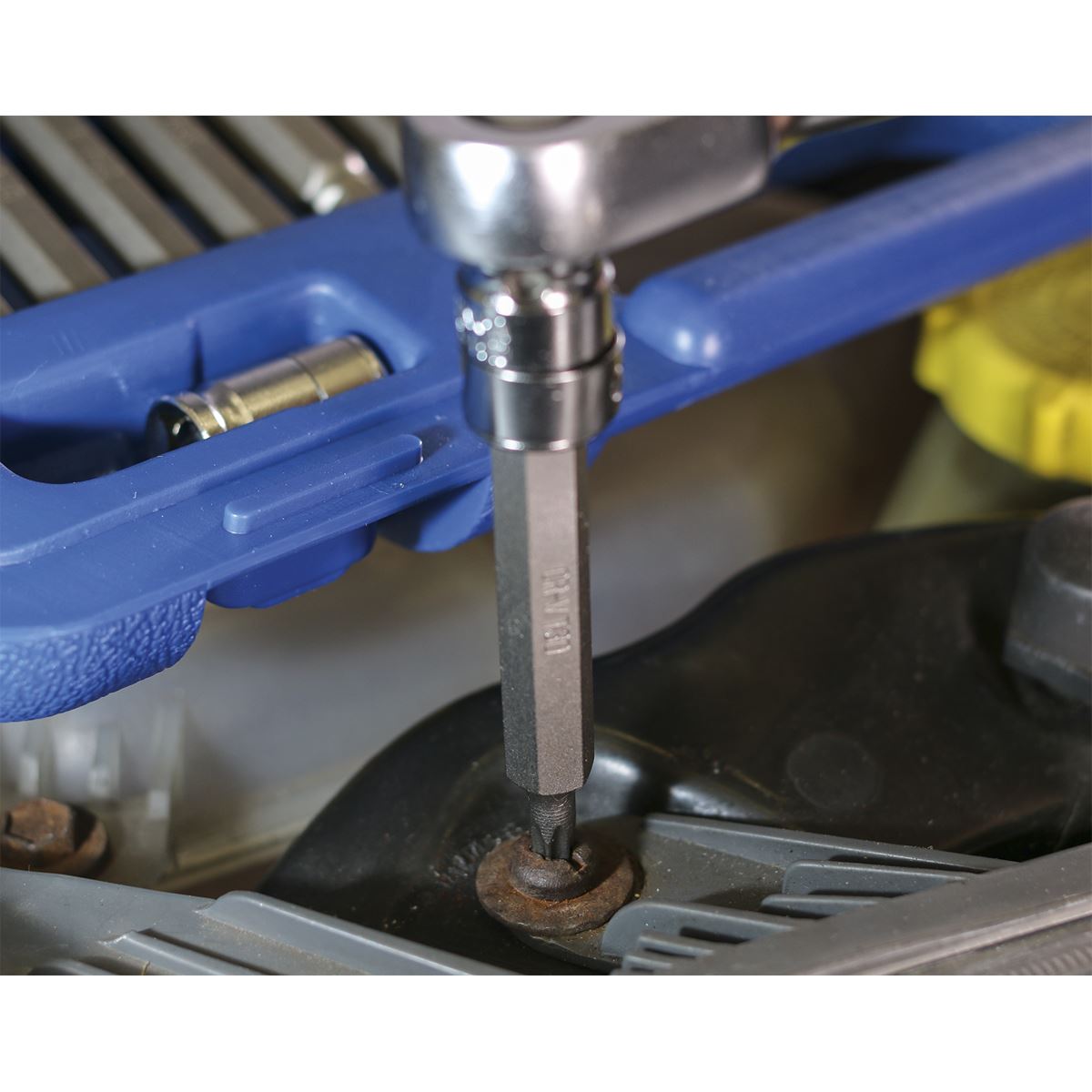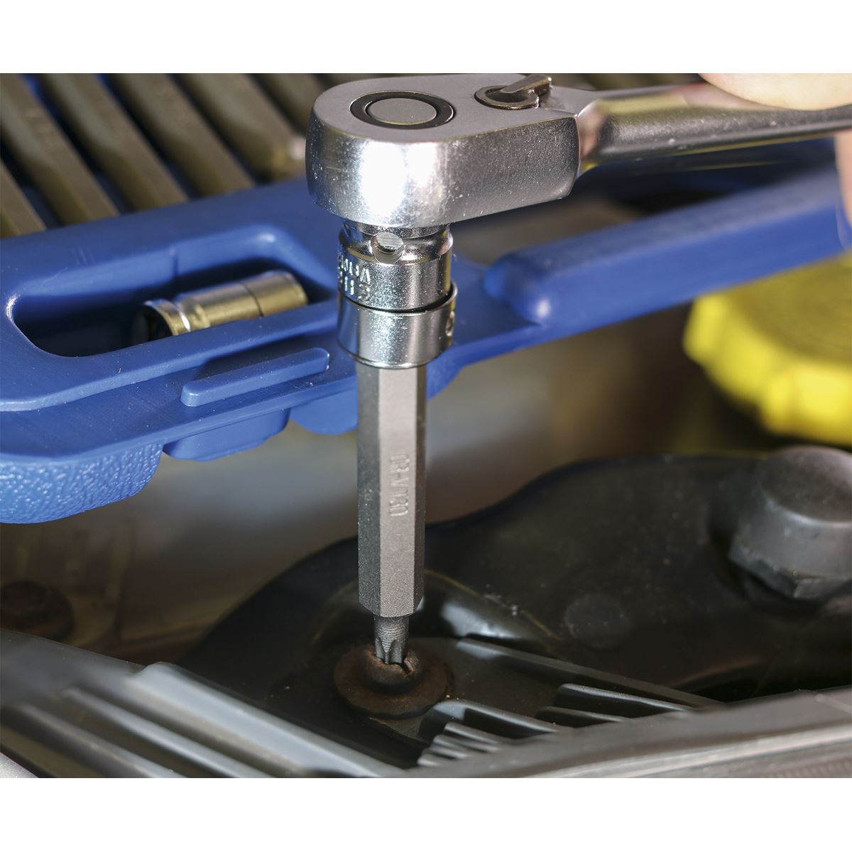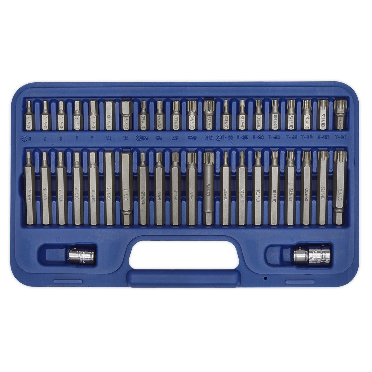 Chrome Vanadium 6150 steel bits hardened to 52-53 HRC and tempered for added strength. Set includes 3/8" and 1/2"Sq drive to 10mm hex Chrome Vanadium steel bit adaptors. Supplied in storage case with inclined tray for quick and easy bit selection.