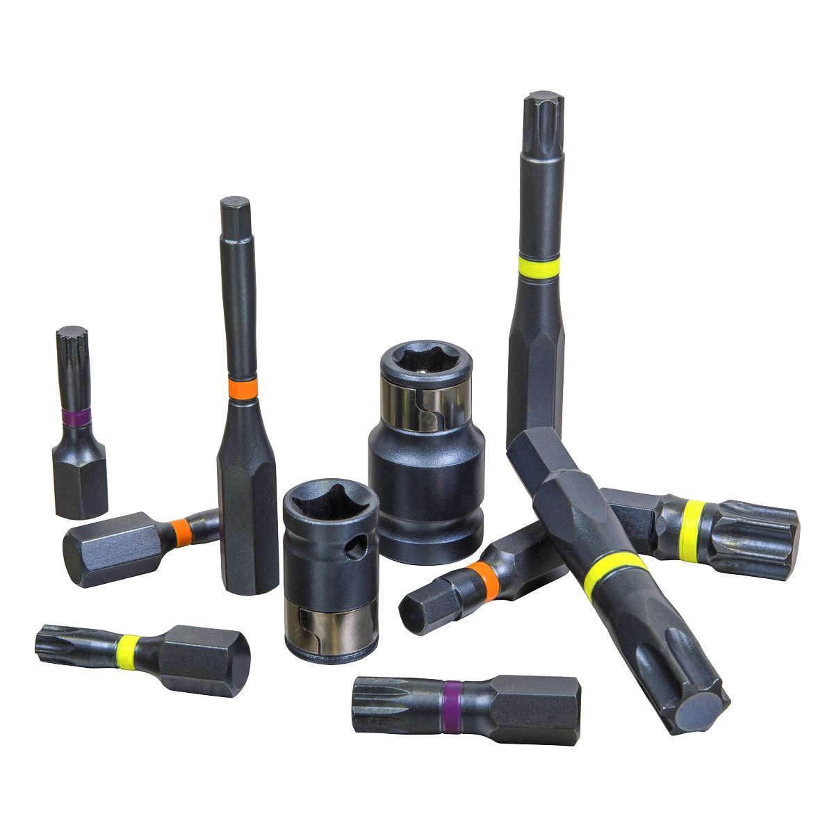 - High quality impact grade S2 steel satin finish 36mm(L) bits. - Specially heat treated CNC machined tips reduce stress and prevent cam-out under load. - Torsion bits absorb impact and transfer maximum torque to the fixing. - Hardened (58-62 HRC) and tempered for added strength. - Colour-coded for fast identification. - Contents: TRX-Star* Bits; T10, T15, T20, T25, T27, T30, T40, T45, T50, T55, T60, Hex Bits; 4, 5, 6, 7, 8, 10, 12mm, Spline Bits; M5, M6, M8, M10, M12, M14, M16, M18, Drive Adaptors; 3/8"Sq x 10mm Hex, 1/2"Sq x 10mm Hex. - Supplied in storage case. - Lifetime guarantee*. - Model No. AK21902- One of a comprehensive range of Premier Hand Tools, suitable for daily professional use. - High quality impact grade S2 steel satin finish 36mm(L) bits. - Specially heat treated CNC machined tips reduce stress and prevent cam-out under load. - Torsion bits absorb impact and transfer maximum torque to the fixing. - Hardened (58-62 HRC) and tempered for added strength. - Colour-coded for fast identification. - Supplied in storage case. - Lifetime guarantee*.
