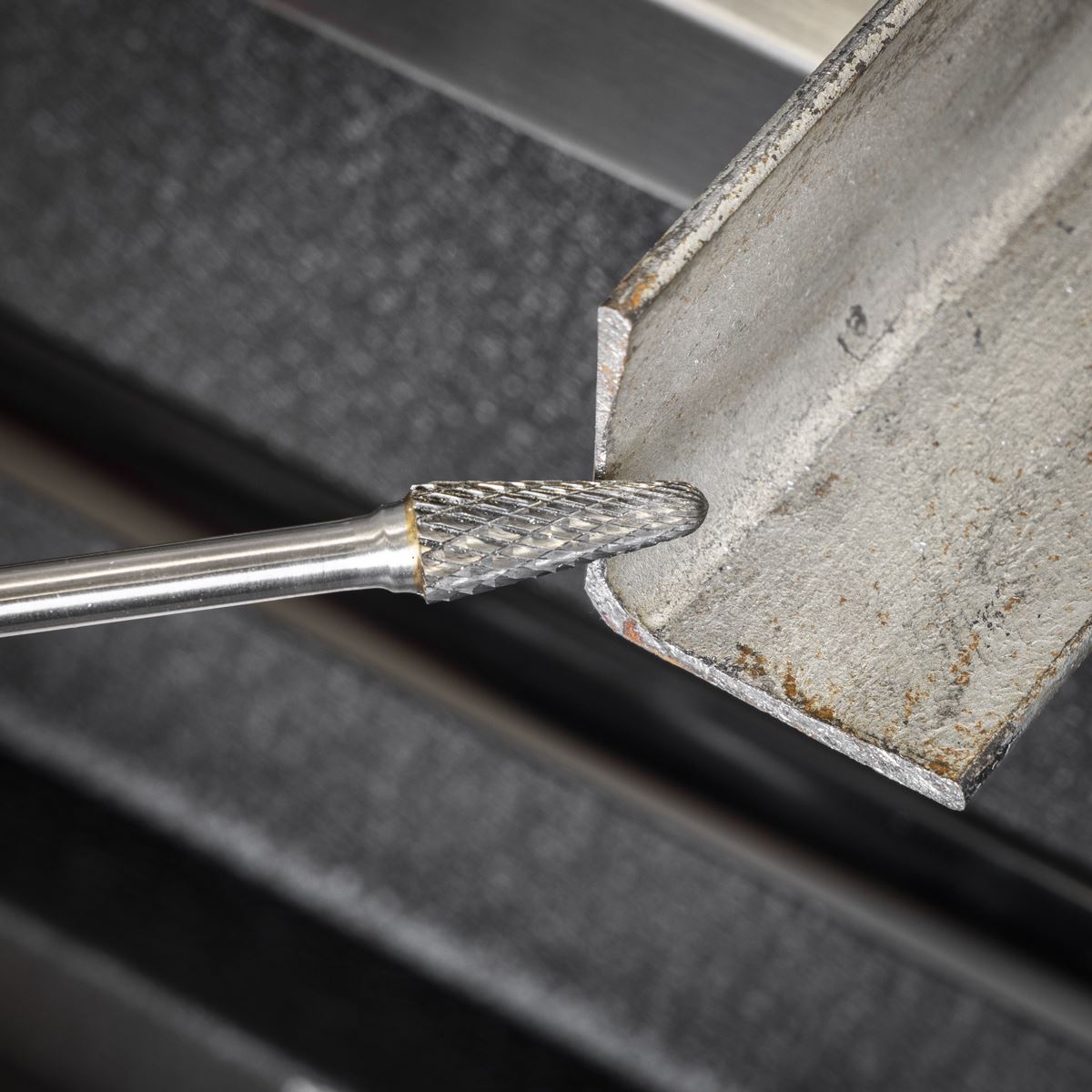 10mm Burr made from Tungsten Carbide. Conical Ball Nose No. 6 cut (universal). For use on soft and hard metals, including welded seams. Supplied in a plastic storage case.