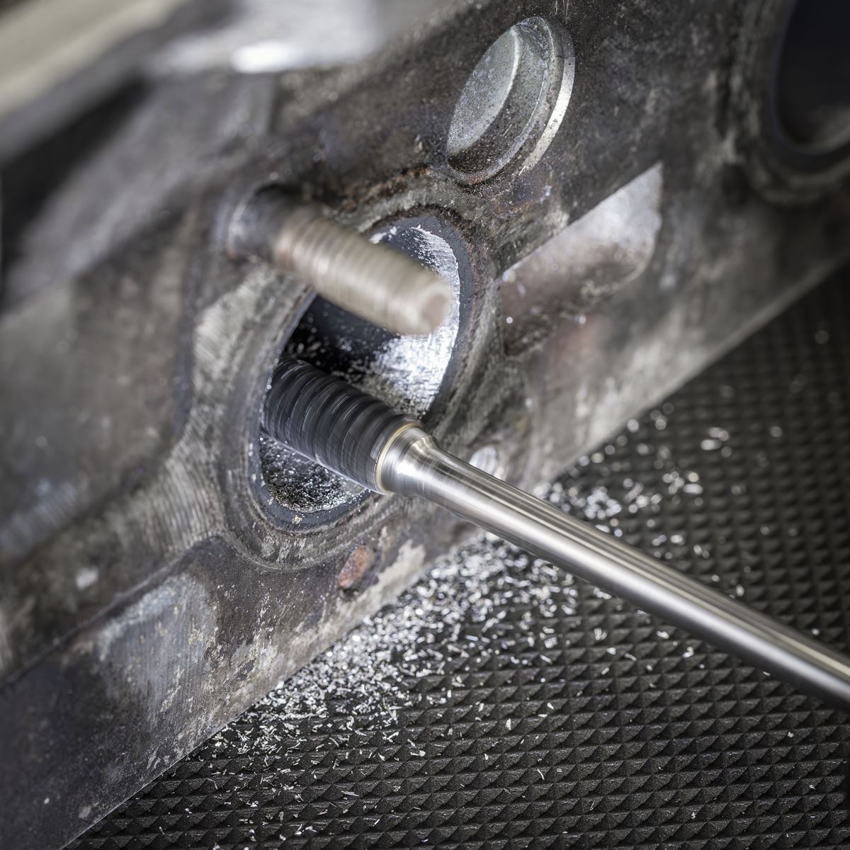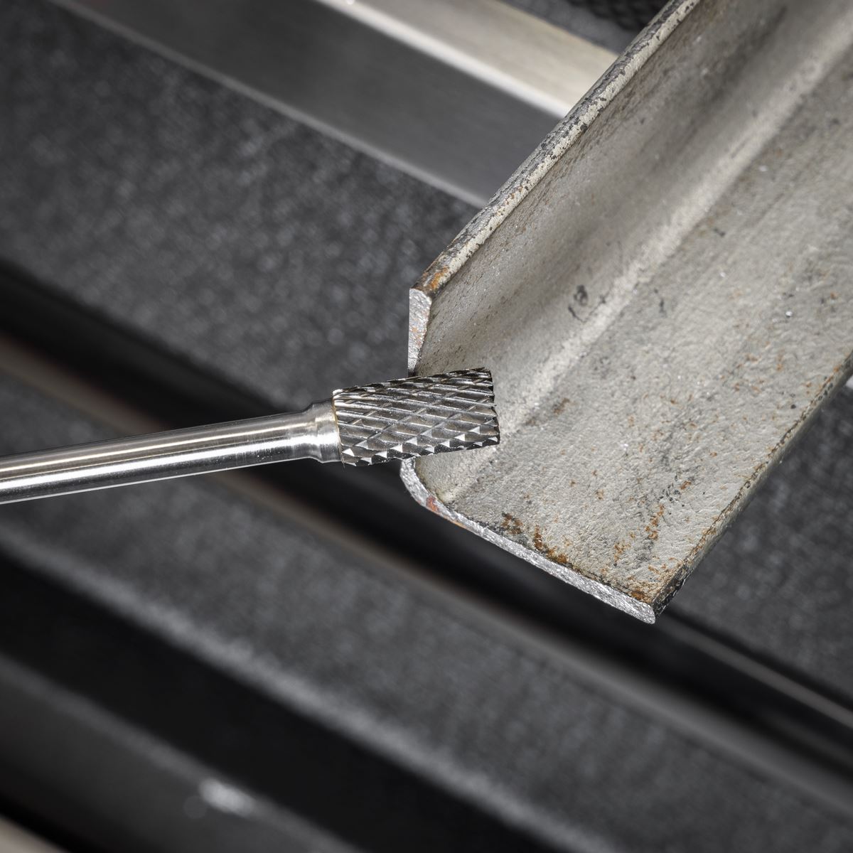 10mm Burr made from Tungsten Carbide. Extra-long 120mm rotary burr. Cylindrical front end No. 6 cut (universal). For use on soft and hard metals, including welded seams. Supplied in a plastic storage box.