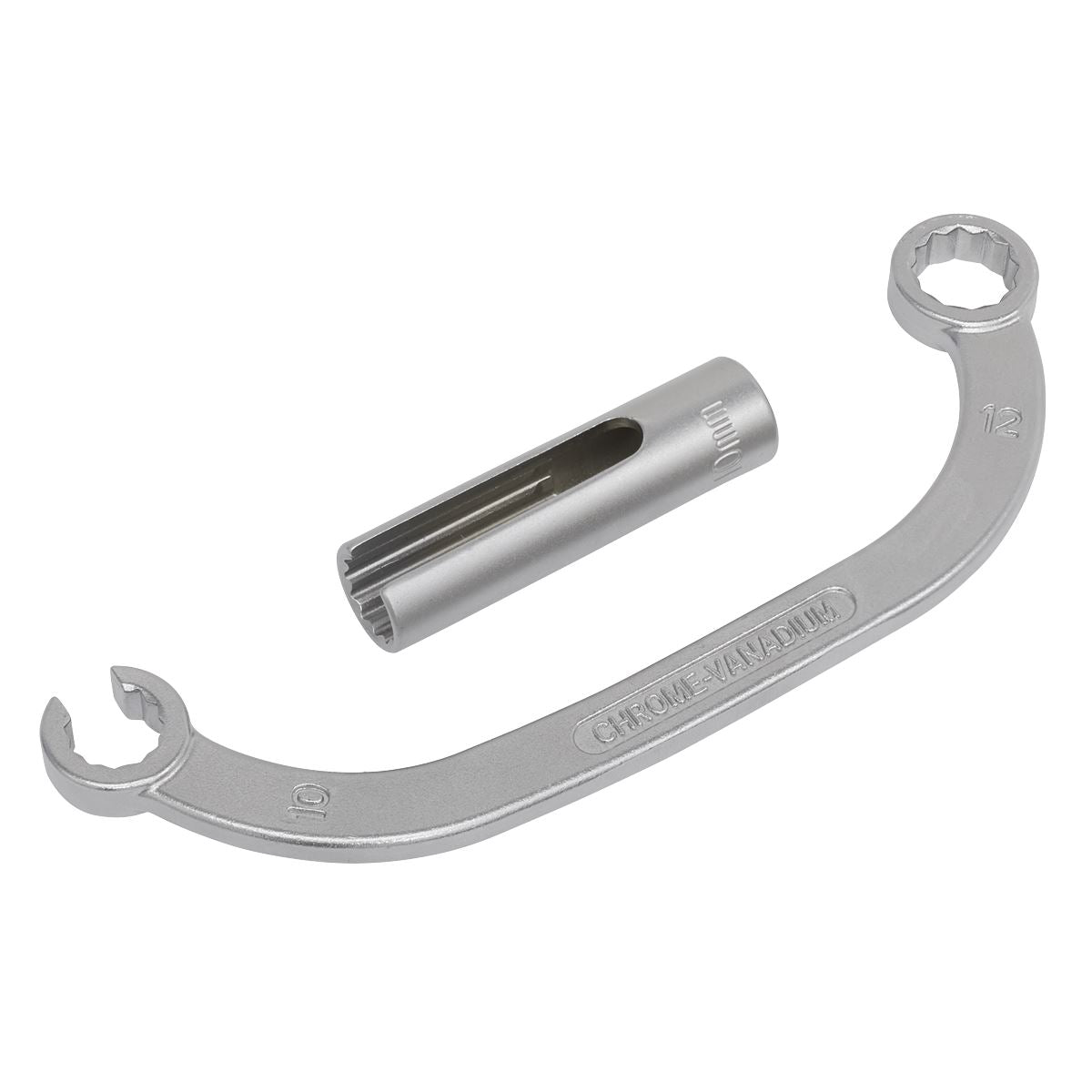 Specially designed spanner and split deep socket to assist in the removal, fitting and adjusting the turbo pressure capsule and turbo actuator on VAG engines. Set includes 1/4"Sq drive socket (10mm x 50mm) and spanner (10mm open-end & 12mm 12-point ring combination). Manufactured from Chrome Vanadium.