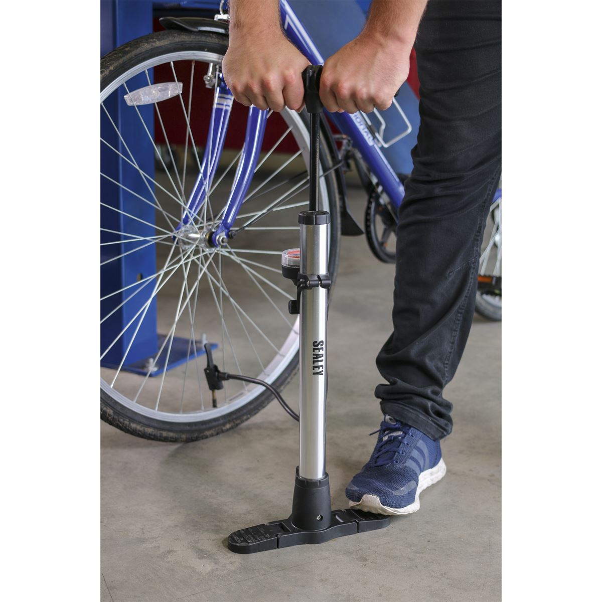 Durable construction with chrome plated steel upright tube. Dial type high pressure gauge with rotating bezel. Gauge calibrated in psi and bar with ranges from 0-160psi and 0-11bar. Fitted with twin head for both Presta and Schrader valves and a 360 rotatable hose. Features a wide base for added stability with foldable foot stand. Supplied with accessories for inflating items such as small inflatable boats, air beds and balls stored in a compartment located in the handle.