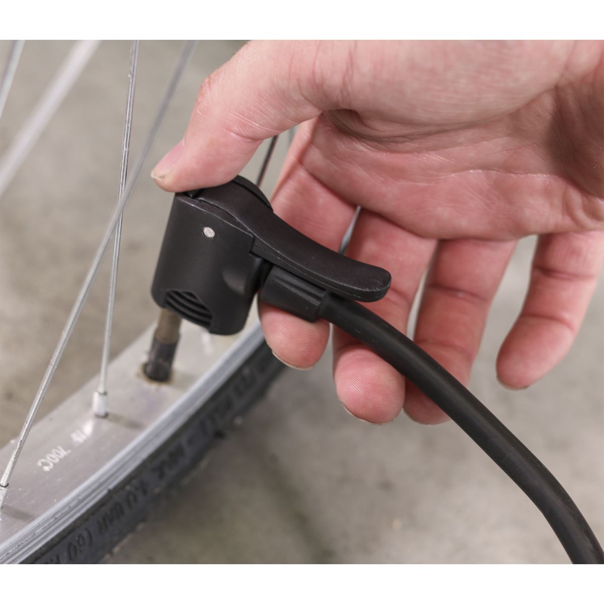 - Durable construction with chrome plated steel upright tube. - Dial type high pressure gauge with rotating bezel. - Gauge calibrated in psi and bar with ranges from 0-160psi and 0-11bar. - Fitted with twin head for both Presta and Schrader valves and a 360 rotatable hose. - Features a wide base for added stability with foldable foot stand. - Supplied with accessories for inflating items such as small inflatable boats, air beds and balls stored in a compartment located in the handle. - Model No. BC110- Durable construction with chrome plated steel upright tube. - Dial type high pressure gauge with rotating bezel. - Gauge calibrated in psi and bar with ranges from 0-160psi and 0-11bar. - Fitted with twin head for both Presta and Schrader valves and a 360 rotatable hose. - Features a wide base for added stability with foldable foot stand. - Supplied with accessories for inflating items such as small inflatable boats, air beds and balls stored in a compartment located in the handle.