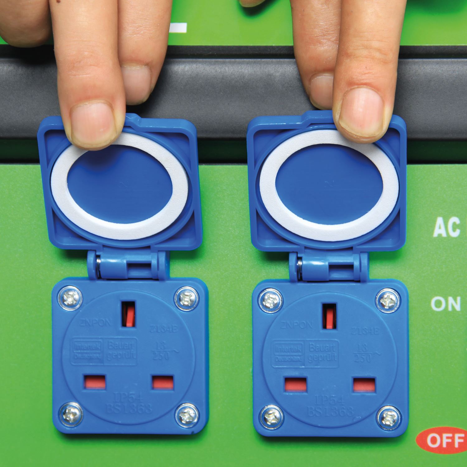 - 2x 230v (13A) AC output sockets and 1x 12v DC battery charging up to 40Ah, ideal for work lights, smaller power tools, and devices