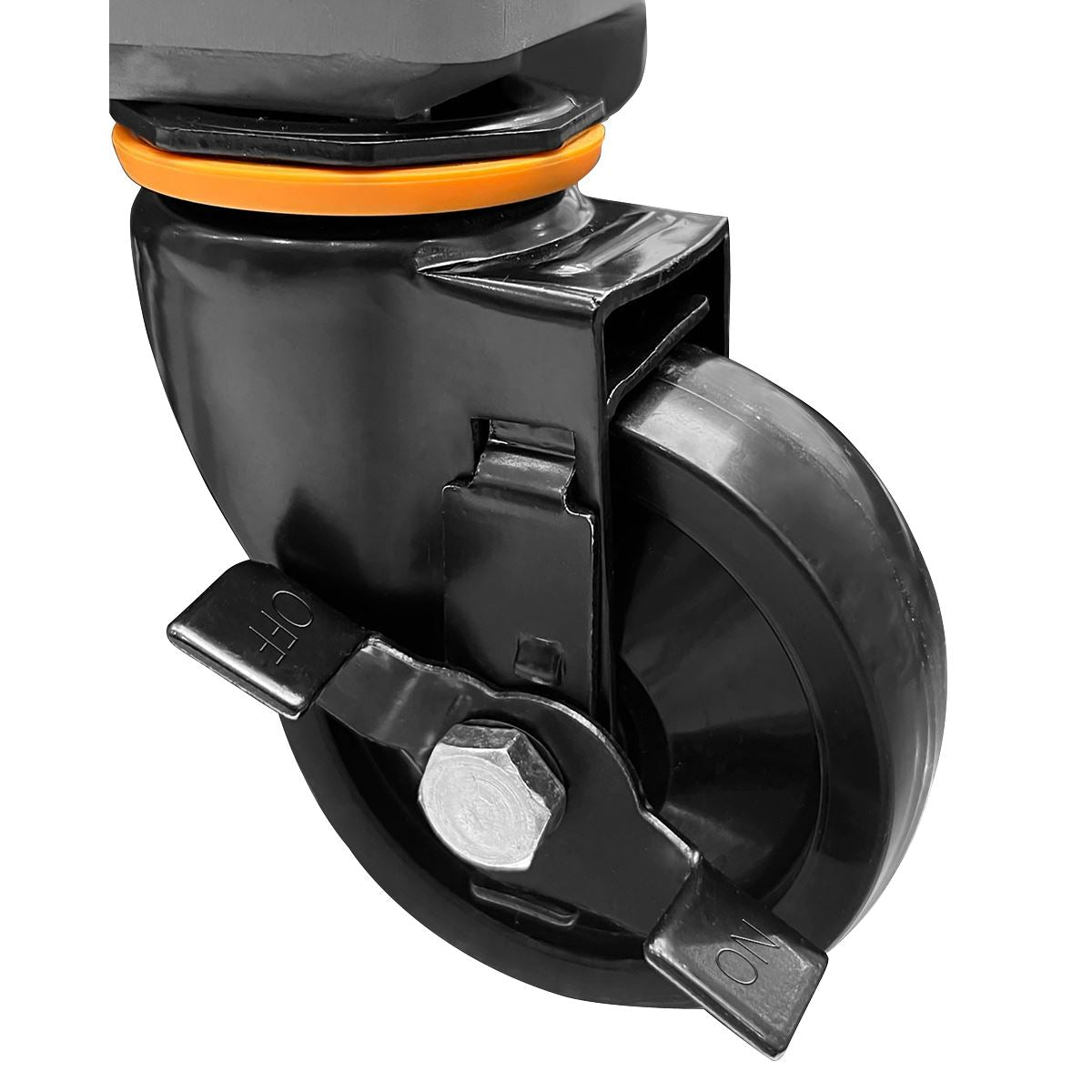 • Strong nylon and fibreglass wheels front and rear. Rear castor wheels come with brakes. An additional wheel for ease of movement when folded, all are non floor marking.