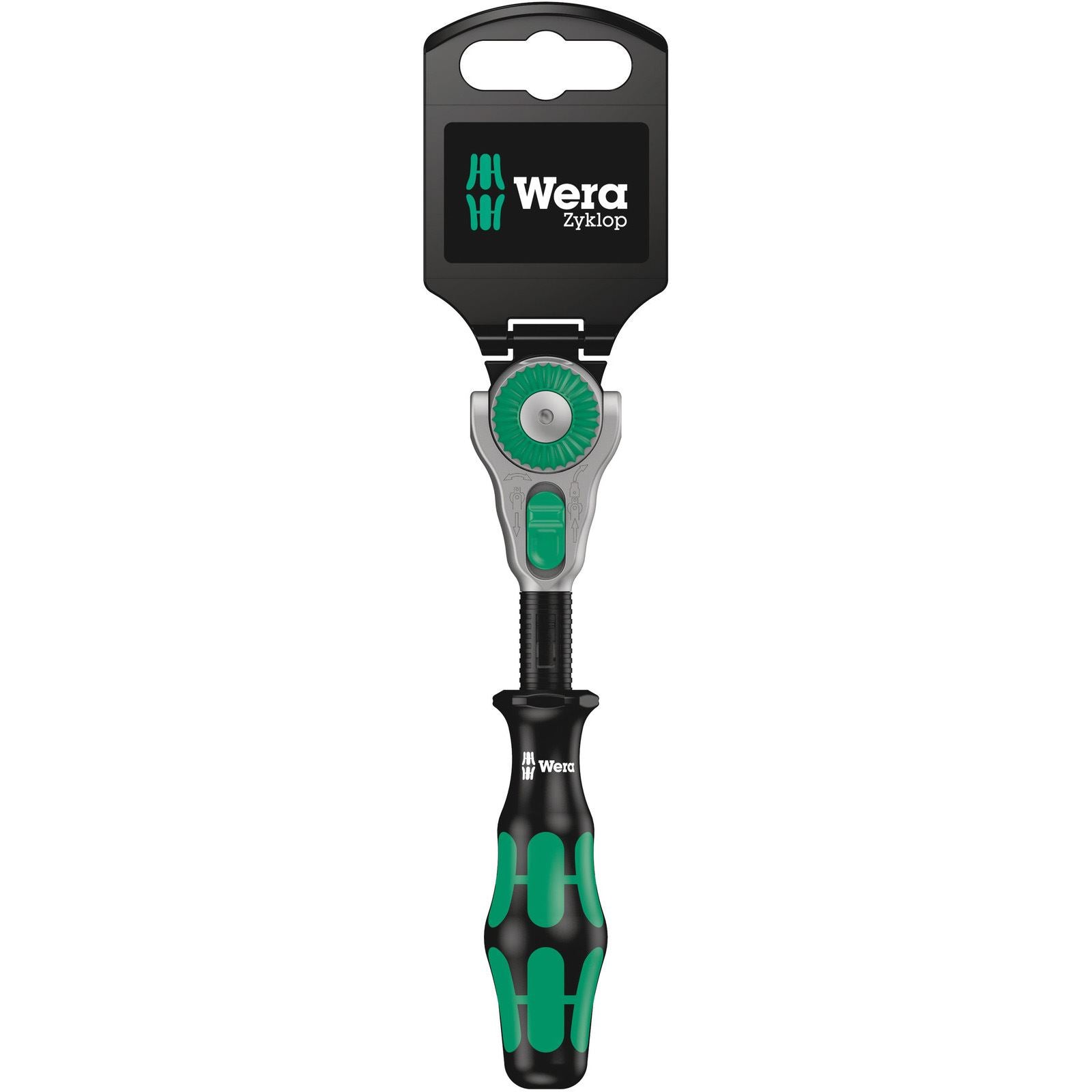 8000 A SB Zyklop Speed Ratchet with 1/4" drive, 1/4" x 152 mm Fine-tooth design allows a small return angle of 5 Freely pivoting ratchet head, push button release and left/right switchover Flywheel design and easy-to-grip free-turning sleeve for very high working speeds The Wera Zyklop Speed ratchet combines the advantages of five different types of ratchet in one. And it is a really fast mover Can also be used as a screwdriver Zyklop ratchet with 1/4" drive. The fine toothing with 72 teeth allows for a low return angle of 5. The ratchet head swivels freely and can be locked in any position using the slide switch on both sides. Unproblematic working with plenty of hand space even in very narrow or difficult-to-reach installation situations. The pre-defined positions at 0. 15 and 90 to the left and right guarantee safe working without the ratchet head slipping. In the 0 position, the ratchet with adapter and bit can be used like a conventional screwdriver. The flywheel design helps accelerate the screwdriving process. The rotationally symmetrical design of the Kraftform handle and the fast-rotating sleeve support rapid turning. Thanks to the shape of the Kraftform handle being perfectly adapted to the hand, hand injuries such as blisters and calluses are avoided. The hard materials used for the handle guarantee quick hand switching without the risk of the skin "sticking" to the handle. The softer, "non-slip" zones offer transmission of high forces without loss. For 1/4" square head socket wrench inserts as well as 1/4" connectors with square head drive, with ball lock. 1 x 1/4"x152.0