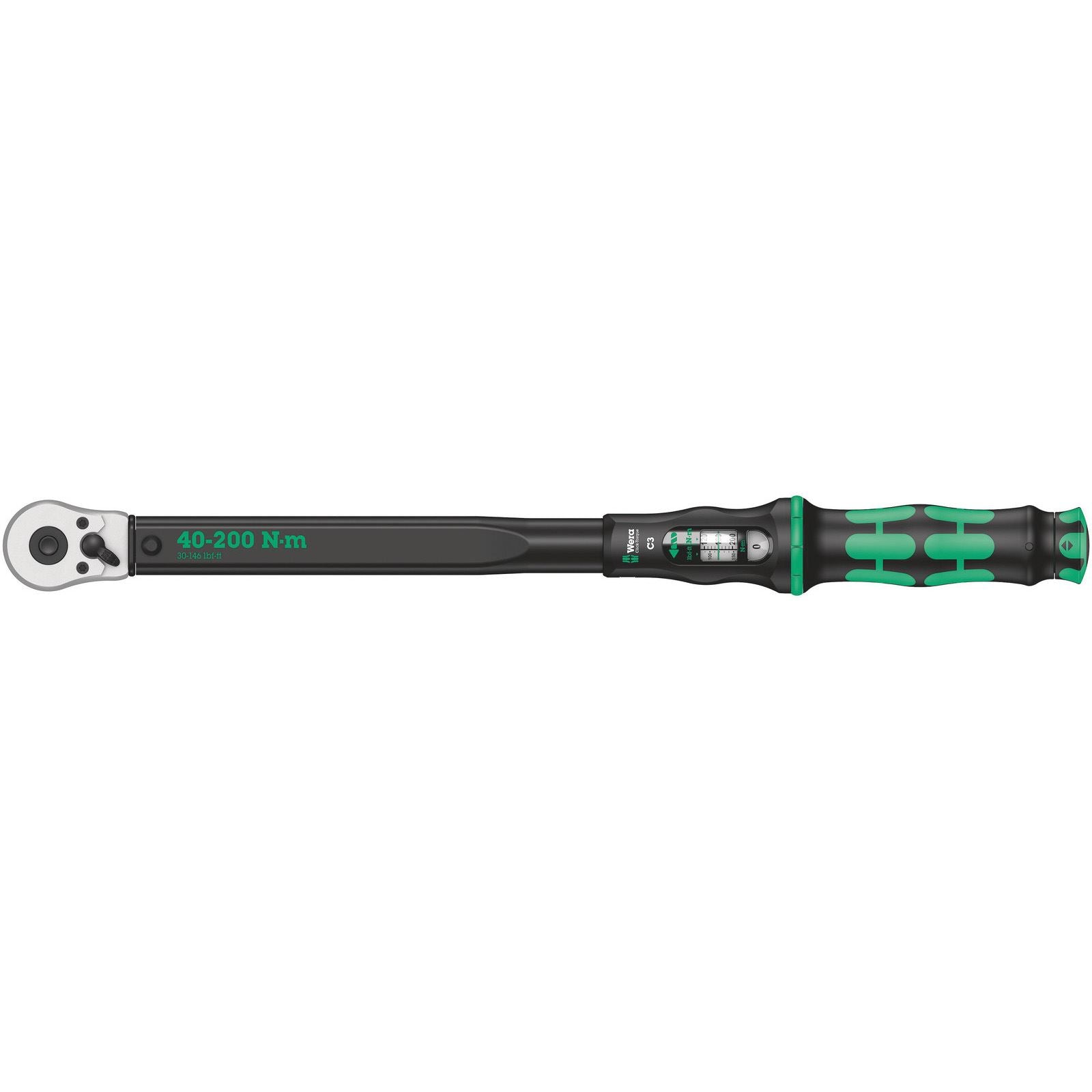 Click-Torque C 3 torque wrench with reversible ratchet, 40-200 Nm, 1/2" x 40-200 Nm With 1/2" square drive, reversible ratchet, 45 teeth Easy setting and saving of the desired torque value with audible and tactile clicks when reaching the scale values Audible and tactile release mechanism when the set torque value is reached Measuring range: 40-200 Nm; precise to +/- 3% as per DIN EN ISO 6789-1:2017-07 With ergonomic 2-component handle suitable for right-hand use Click-Torque wrench in the unmistakable, robust Wera design with high accuracy as per DIN EN ISO 6789-1: 2017-07. Easy setting and saving of the default value. The audible and tactile clicks on reaching the scale values also facilitate the safe setting of the desired torque value. The robust release mechanism guarantees a clearly audible and tactile release signal when the set torque is reached. For right-hand use (clockwise torque-control) and with 45-tooth reversible ratchet mechanism. 1/2"x40-200