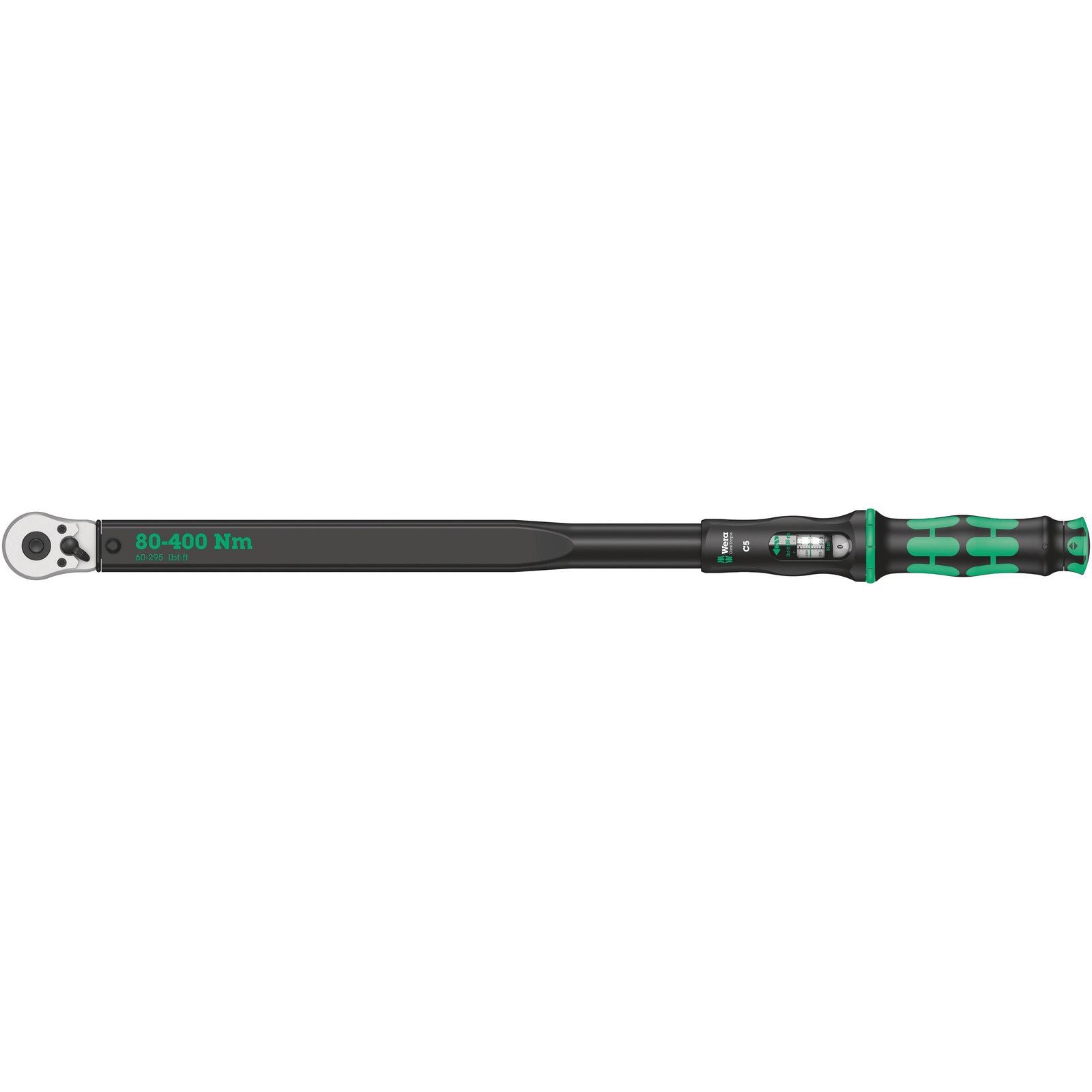 Click-Torque C 5 torque wrench with reversible ratchet, 80-400 Nm, 1/2" x 80-400 Nm With 1/2" square drive, reversible ratchet, 45 teeth Easy setting and saving of the desired torque value with audible and tactile clicks when reaching the scale values Audible and tactile release mechanism when the set torque value is reached Measuring range:80-400 Nm; Precise to +/- 3% as per DIN EN ISO 6789-1:2017-07 With ergonomic 2-component handle suitable for right-hand use Click-Torque wrench in the unmistakable, robust Wera design with high accuracy as per DIN EN ISO 6789-1: 2017-07. Easy setting and saving of the default value. The audible and tactile clicks on reaching the scale values also facilitate the safe setting of the desired torque value. The robust release mechanism guarantees a clearly audible and tactile release signal when the set torque is reached. For right-hand use (clockwise torque-control) and with 45-tooth reversible ratchet mechanism. 1/2"x80-400