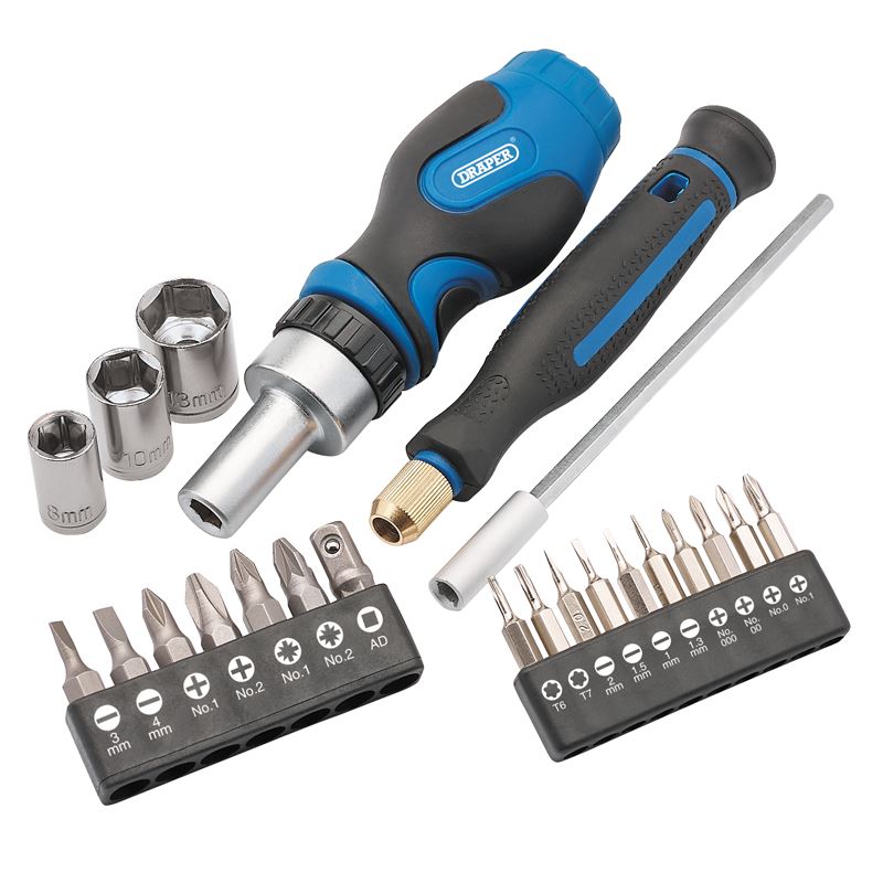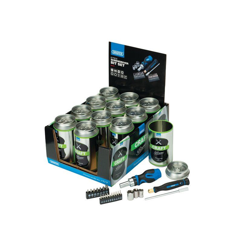 This special edition stubby ratchet screwdriver set includes a range of standard and precision screwdriver bits and 6-point sockets ideal for use around the home or workshop. The stubby screwdriver has a forward and reverse ratchet with locking action and 1/4" magnetic bit holder. There is a soft grip handle for user comfort. The screwdriver bits are manufactured from chrome vanadium steel and are arranged inside a sturdy plastic storage holder. All supplied inside a special edition beer can making it an ideal gift set.
